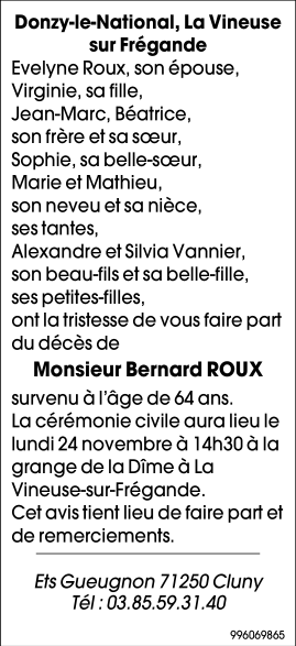 Cet espace « condoléances » est dédié à la mémoire de Monsieur BERNARD ROUX.