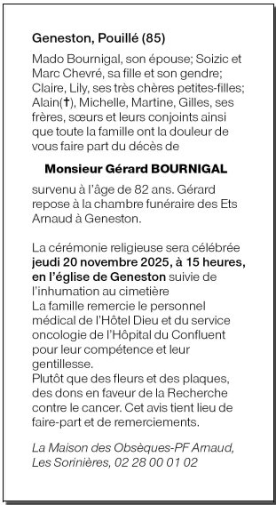 Cet espace « condoléances » est dédié à la mémoire de Monsieur Gérard BOURNIGAL.