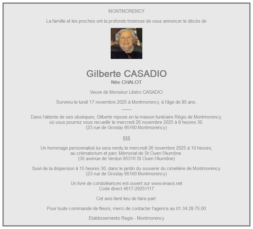Cet espace « condoléances » est dédié à la mémoire de Madame Gilberte CASADIO née CHALOT.