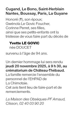 Cet espace « condoléances » est dédié à la mémoire de Madame Yvette LA GOVIC née DOUCET.