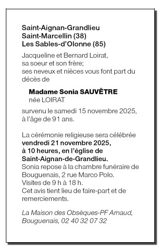 Cet espace « condoléances » est dédié à la mémoire de Madame Sonia SAUVETRE née LOIRAT.