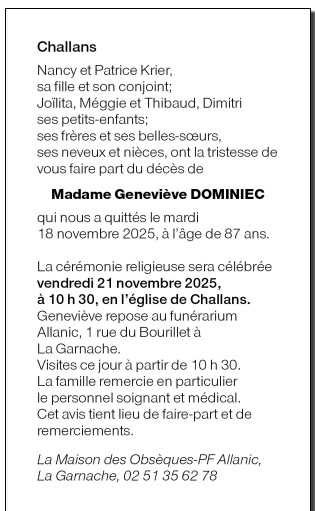 Cet espace « condoléances » est dédié à la mémoire de Madame Geneviève DOMINIEC.