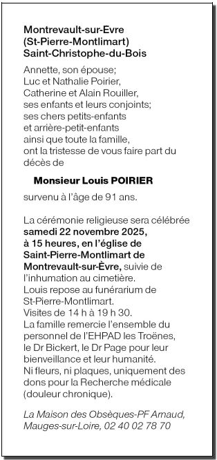 Décédé à Saint Pierre Montlimart (49110) le vendredi 14 novembre 2025