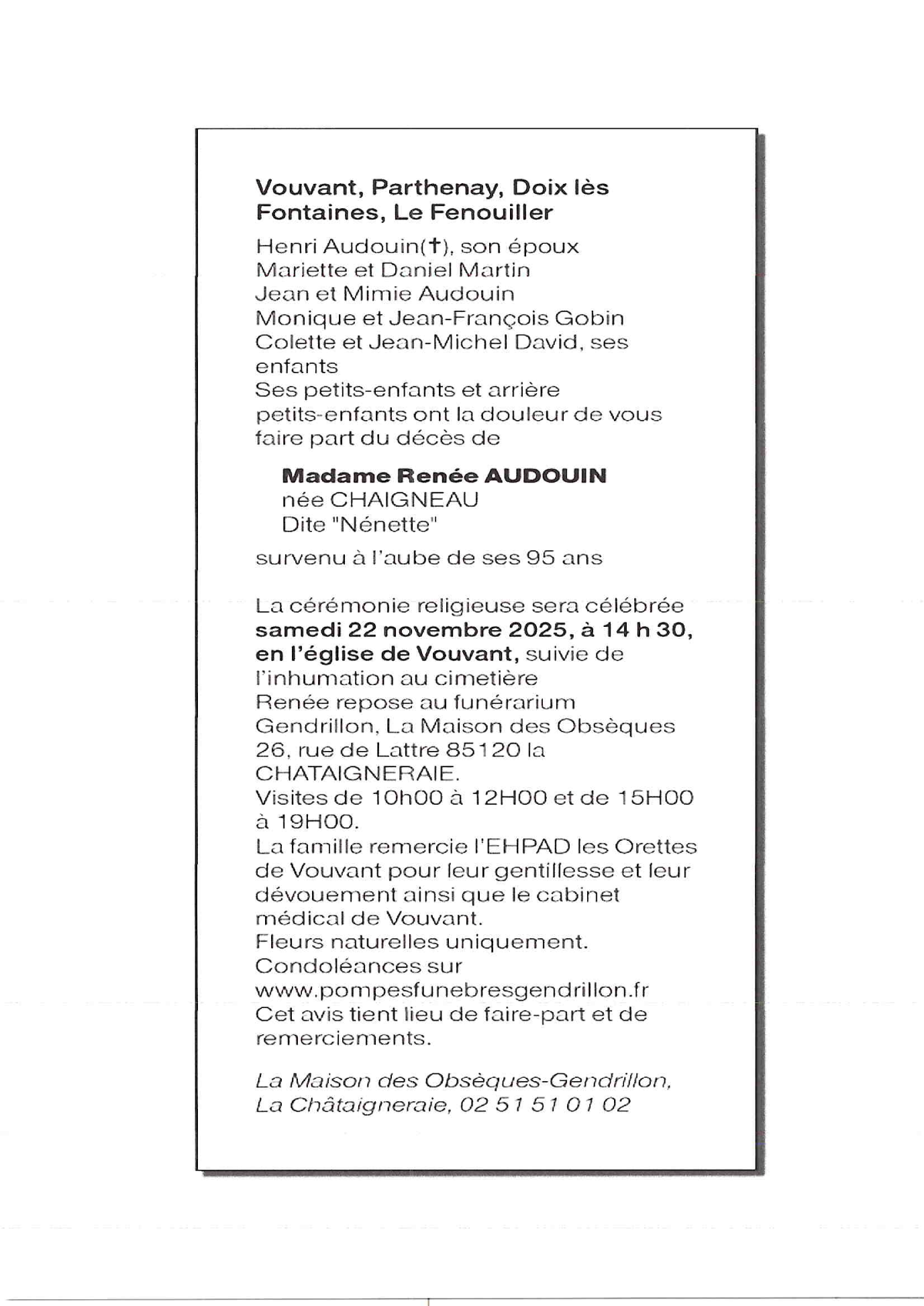 Cet espace « condoléances » est dédié à la mémoire de Madame Renée AUDOUIN.