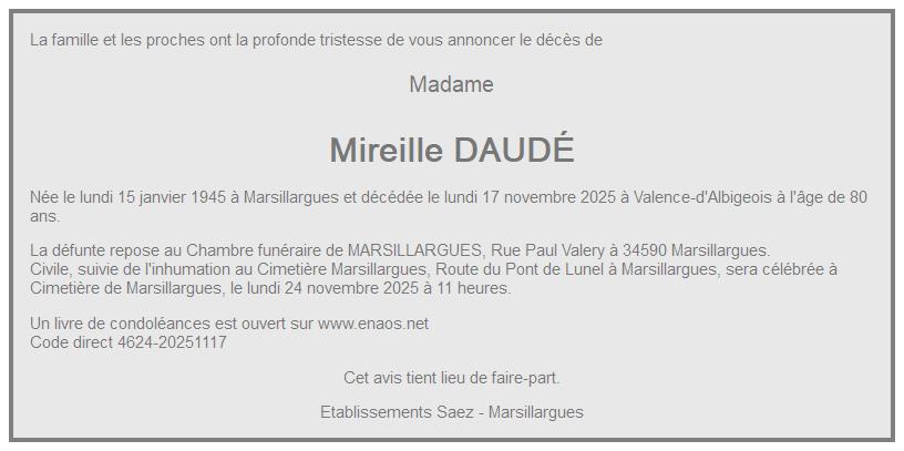 Cet espace « condoléances » est dédié à la mémoire de Madame Mireille DAUDÉ.
