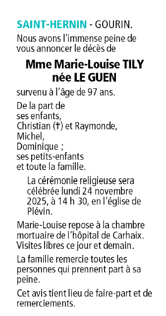 Cet espace « condoléances » est dédié à la mémoire de Madame Marie-Louise TILY née LE GUEN.