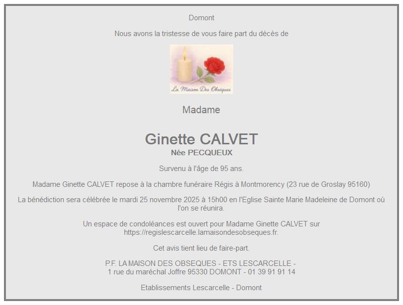 Cet espace « condoléances » est dédié à la mémoire de Madame Ginette CALVET née PECQUEUX.