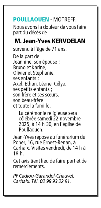 Cet espace « condoléances » est dédié à la mémoire de Monsieur Jean-Yves KERVOELAN.