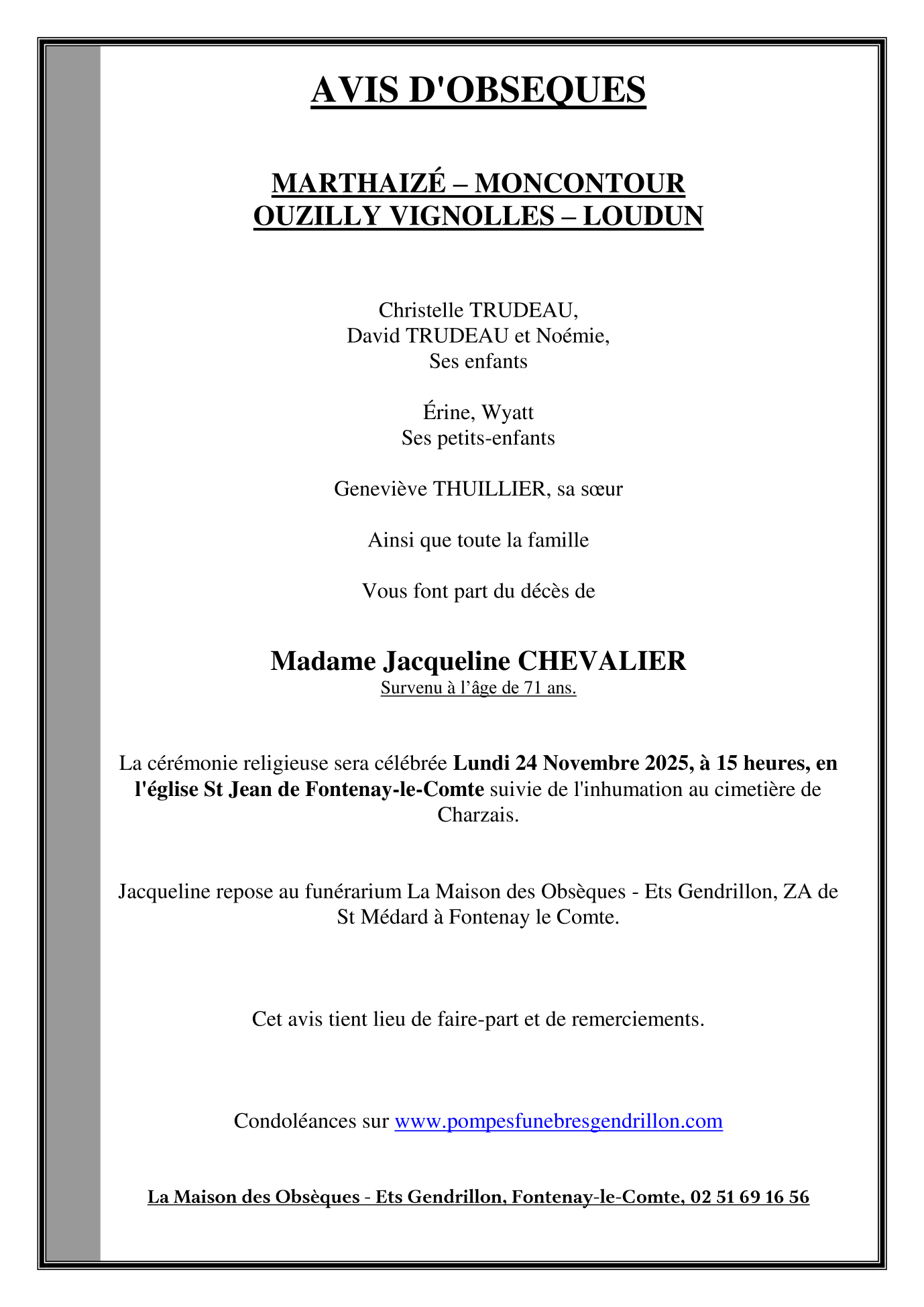 Cet espace « condoléances » est dédié à la mémoire de Madame Jacqueline CHEVALIER.