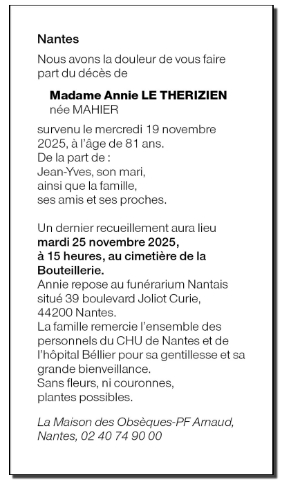 de Madame Annie LE THERIZIEN née MAHIER