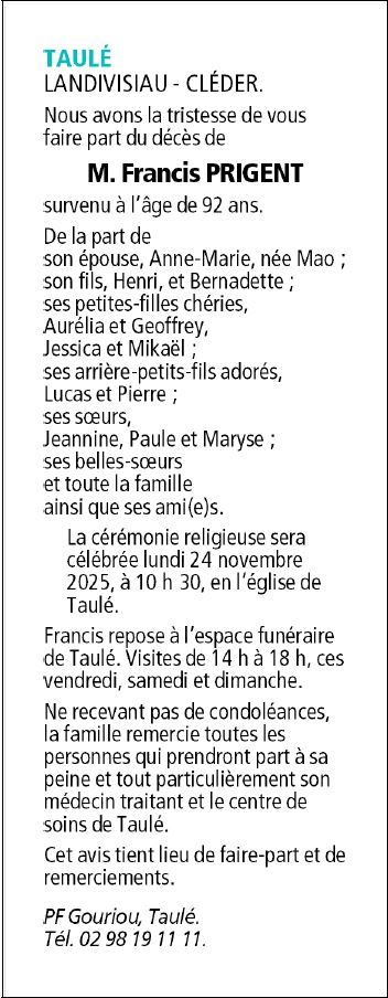 Cet espace « condoléances » est dédié à la mémoire de Monsieur Francis PRIGENT.