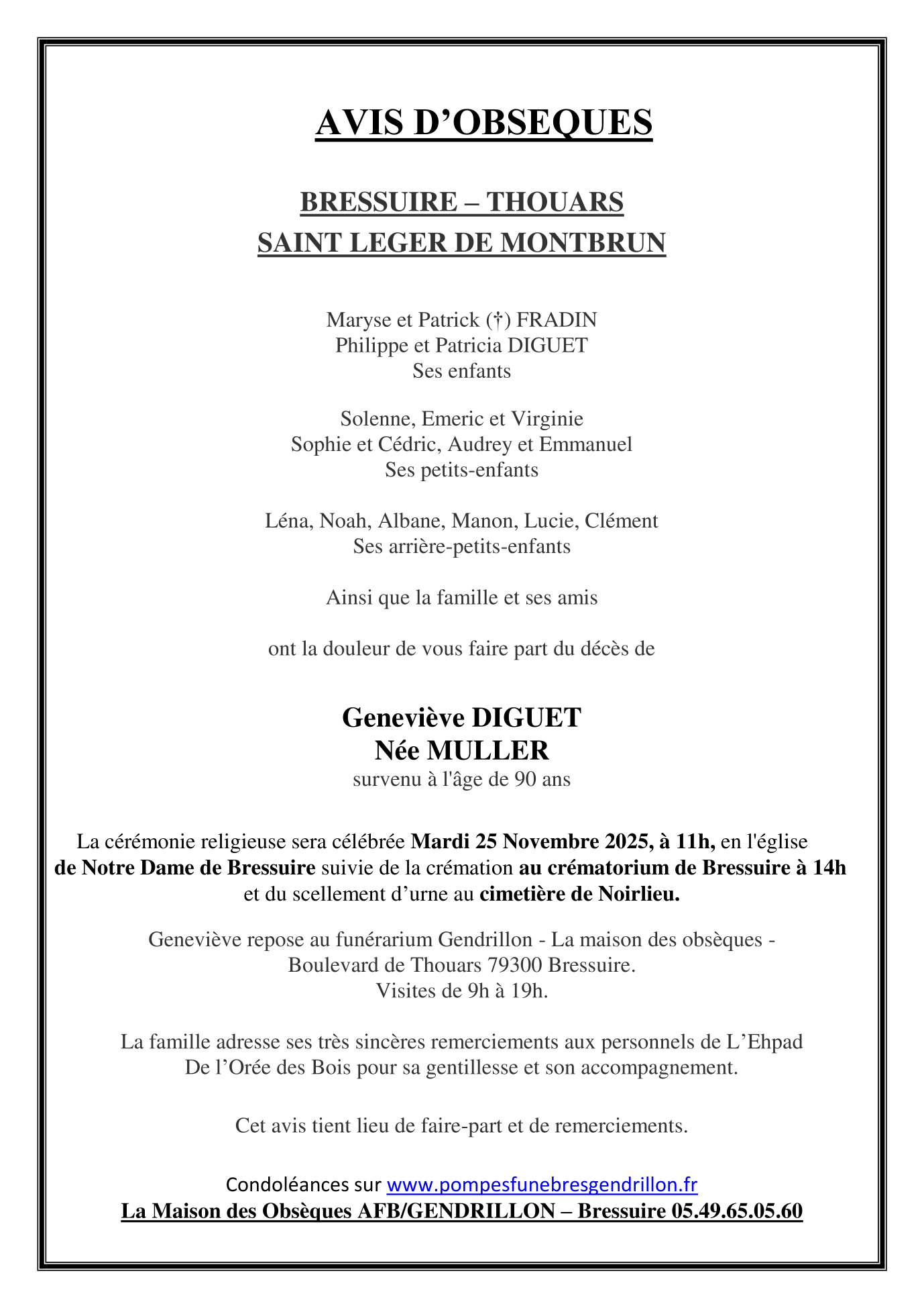 Cet espace « condoléances » est dédié à la mémoire de Madame Marie DIGUET née MULLER.