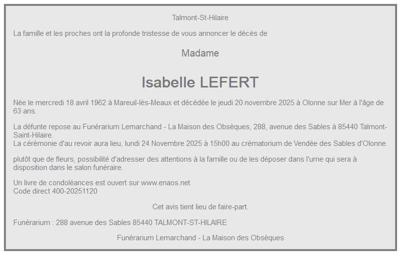 Cet espace « condoléances » est dédié à la mémoire de Madame Isabelle LEFERT.