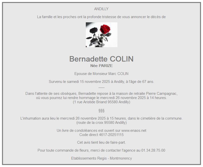 Cet espace « condoléances » est dédié à la mémoire de Madame Bernadette COLIN née PARIZE.