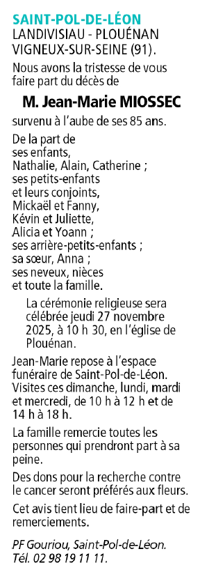Cet espace « condoléances » est dédié à la mémoire de Monsieur Jean-Marie MIOSSEC.