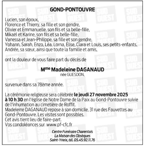 de Madame Madeleine DAGANAUD née GUESDON