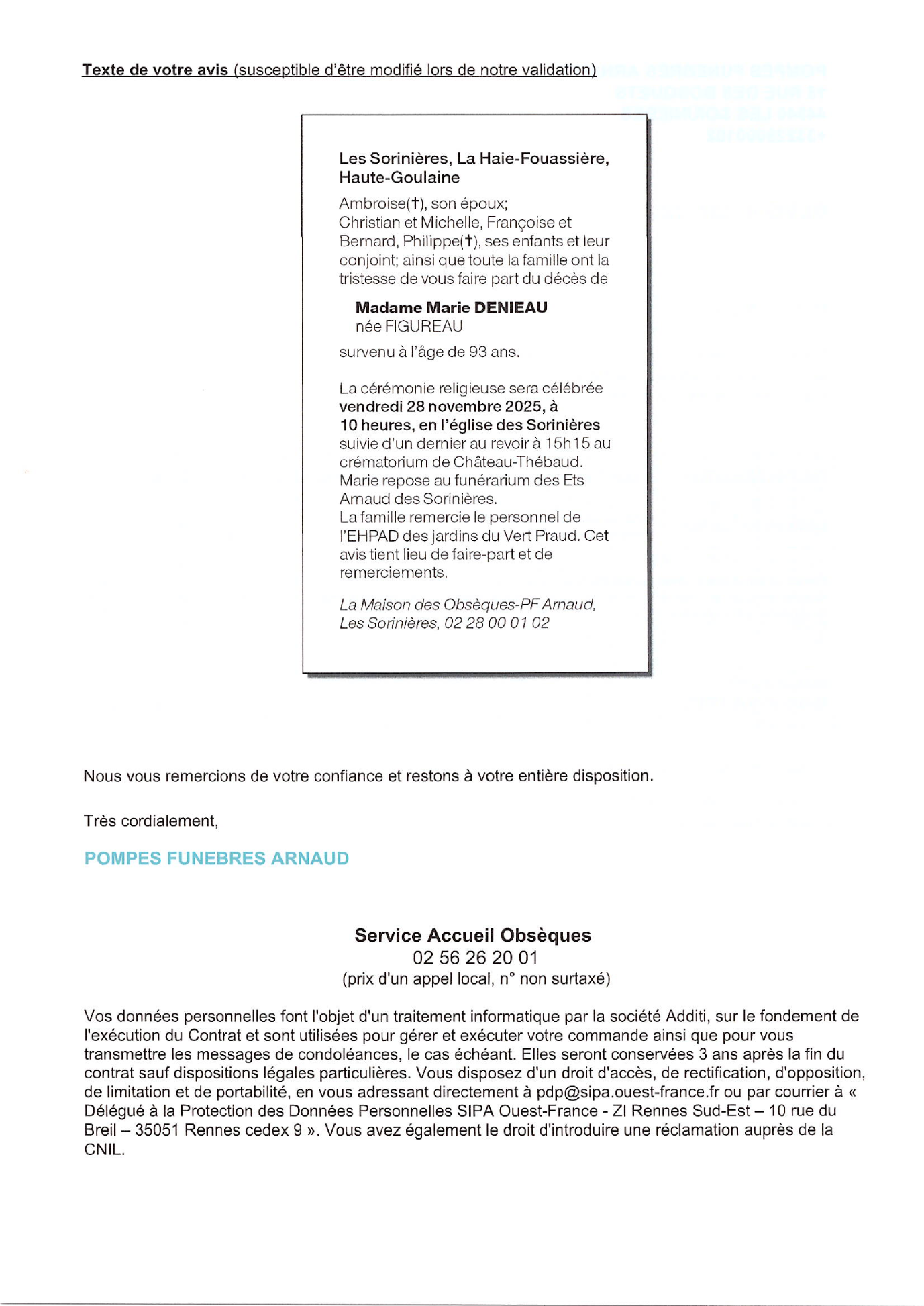 Cet espace « condoléances » est dédié à la mémoire de Madame Marie DENIEAU née FIGUREAU.