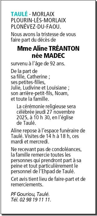 Décédée à Taulé (29670) le lundi 24 novembre 2025