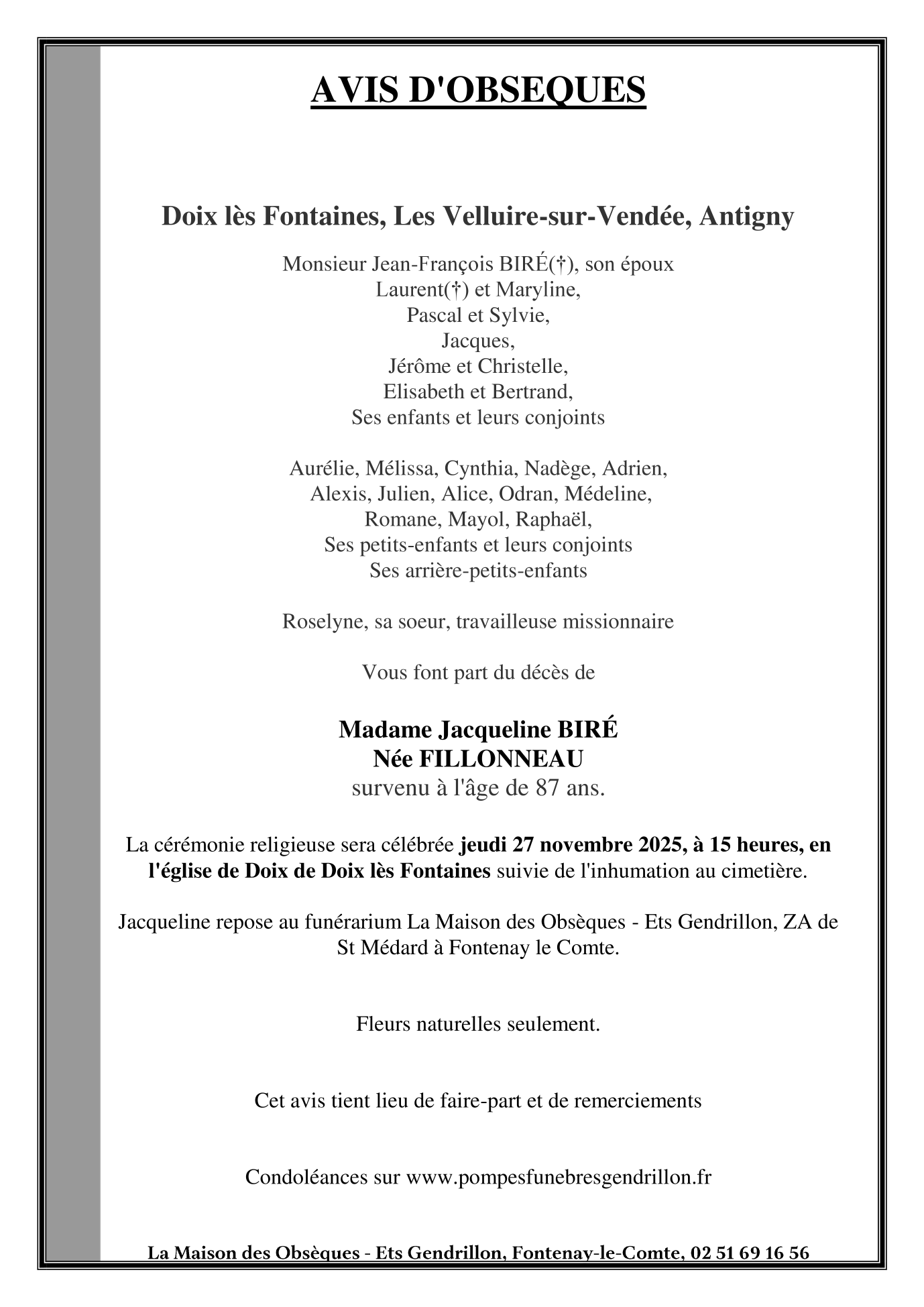 Cet espace « condoléances » est dédié à la mémoire de Madame Jacqueline FILLONNEAU.