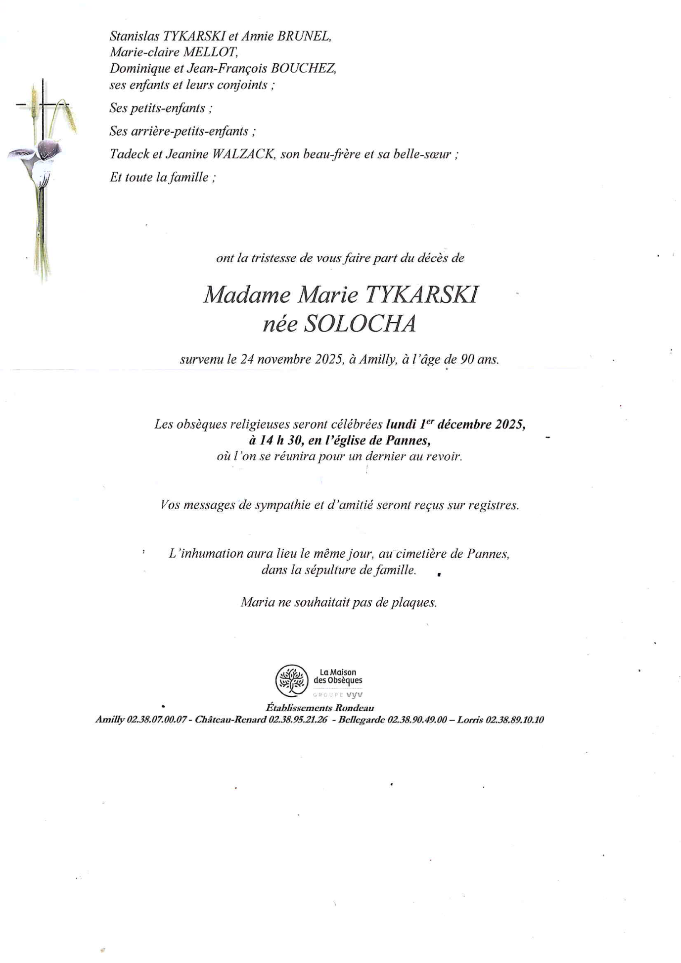 Cet espace « condoléances » est dédié à la mémoire de Madame Maria TYKARSKI née SOLOCHA.