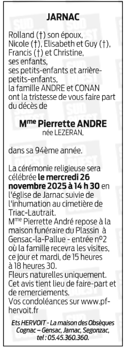 Cet espace « condoléances » est dédié à la mémoire de Madame Pierrette ANDRE née LEZERAN.
