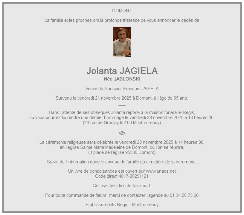 Cet espace « condoléances » est dédié à la mémoire de Madame Jolanta JAGIELA née JABLONSKI.