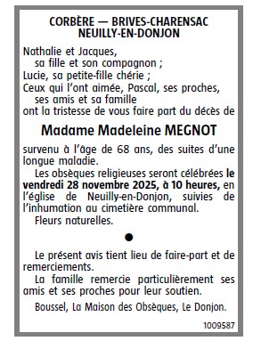 Cet espace « condoléances » est dédié à la mémoire de Madame Madeleine MEGNOT.