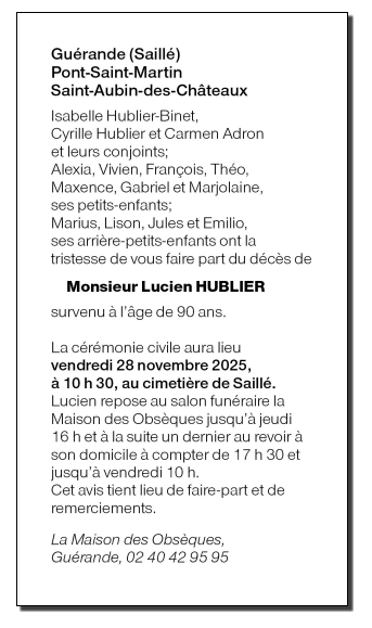 Cet espace « condoléances » est dédié à la mémoire de Monsieur Lucien HUBLIER.