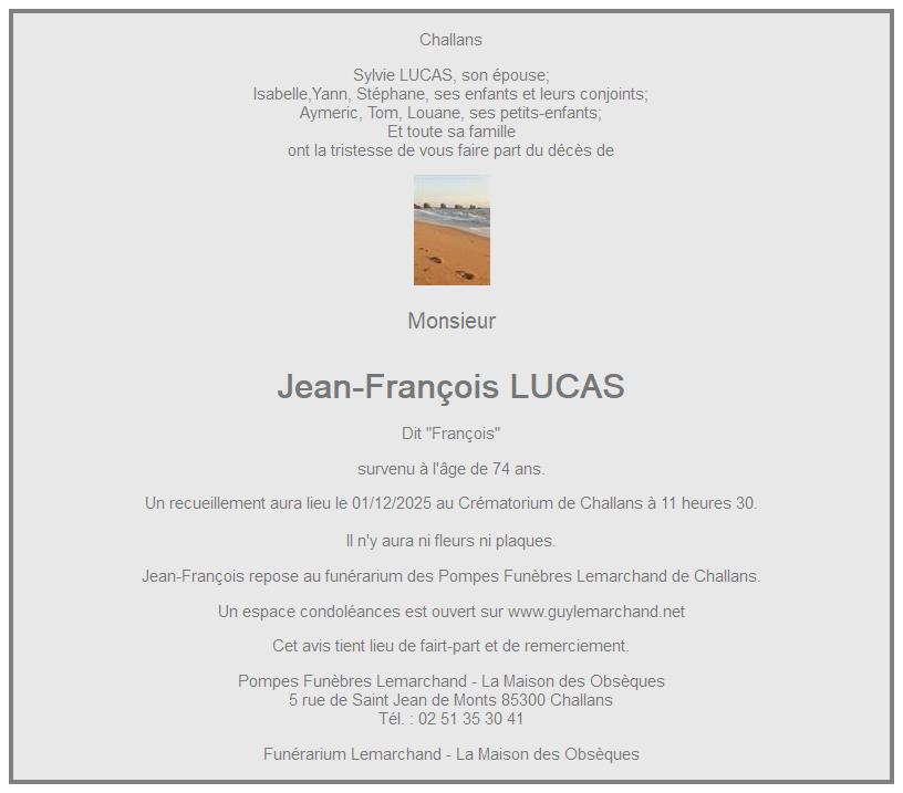 Cet espace « condoléances » est dédié à la mémoire de Monsieur Jean-François LUCAS.
