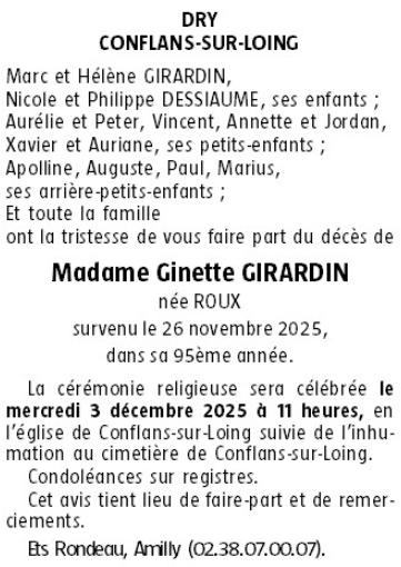 Cet espace « condoléances » est dédié à la mémoire de Madame Ginette GIRARDIN née ROUX.