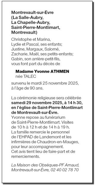 de Madame Yvonne ATHMEN née TALEC