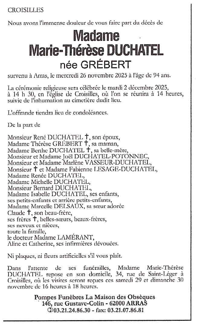 de Madame Marie-Thérèse DUCHATEL née GRÉBERT