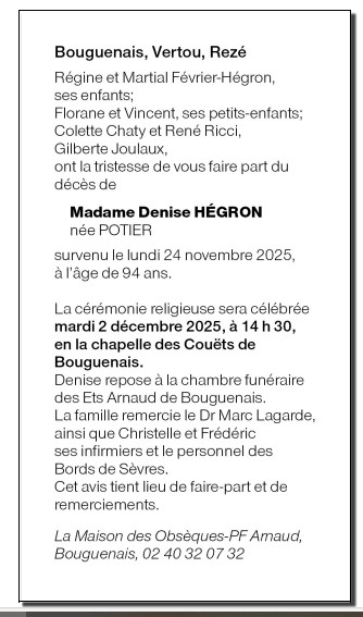 Cet espace « condoléances » est dédié à la mémoire de Madame Denise HÉGRON née POTIER.