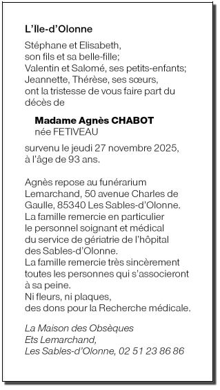 Cet espace « condoléances » est dédié à la mémoire de Madame Agnès CHABOT née FETIVEAU.