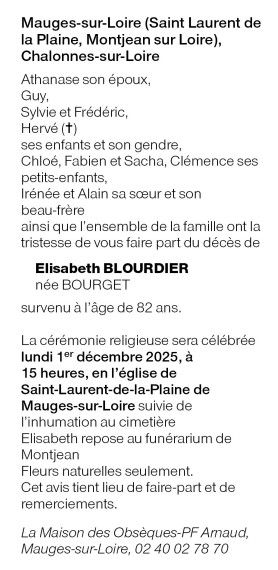 Cet espace « condoléances » est dédié à la mémoire de Madame Elisabeth BLOURDIER née BOURGET.