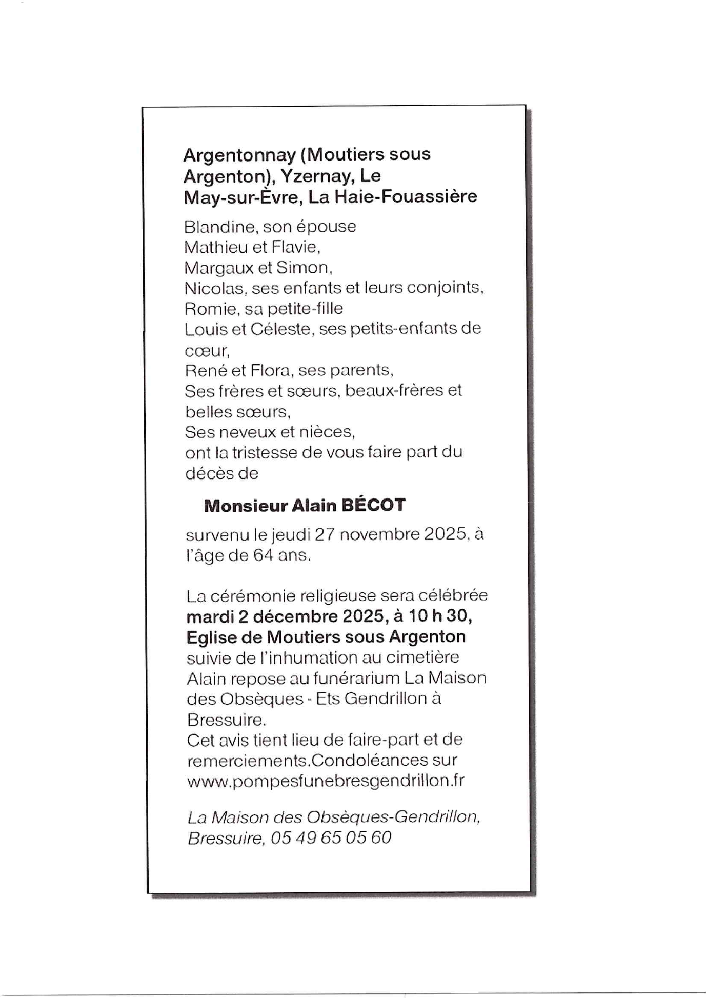 Décédé à Moutiers sous Argenton (79150) le jeudi 27 novembre 2025