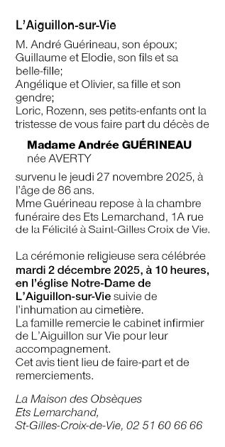 Décédée à L'Aiguillon-sur-Vie (85220) le jeudi 27 novembre 2025
