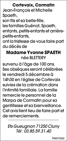 de Madame Yvonne SPAETH née BLETTERY