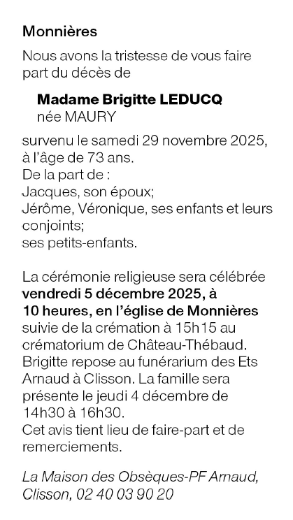 Cet espace « condoléances » est dédié à la mémoire de Madame Brigitte LEDUCQ née MAURY.