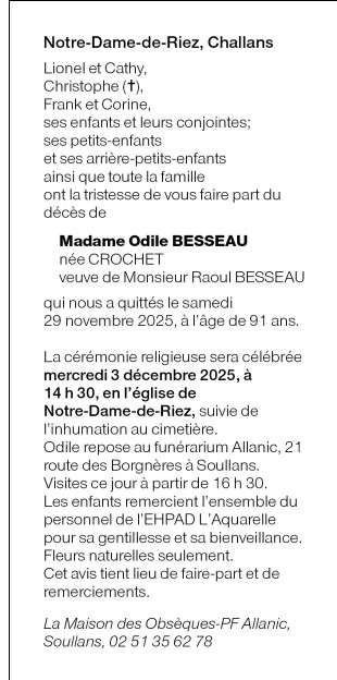 Cet espace « condoléances » est dédié à la mémoire de Madame Odile BESSEAU née CROCHET.