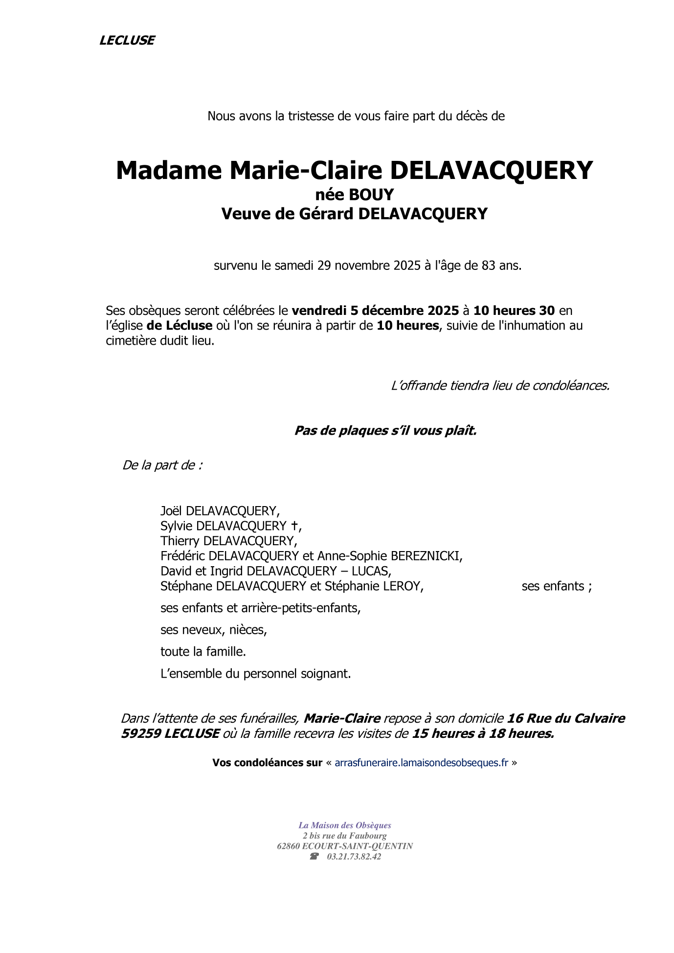 de Madame Marie-Claire DELAVACQUERY née BOUY