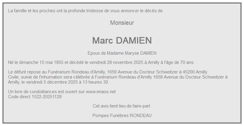 Cet espace « condoléances » est dédié à la mémoire de Monsieur Marc DAMIEN.