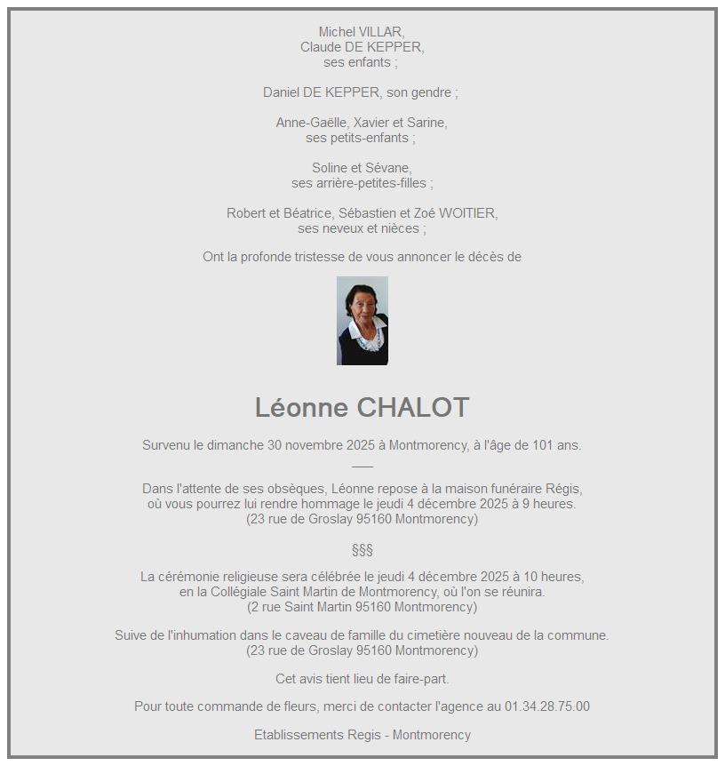 Cet espace « condoléances » est dédié à la mémoire de Madame Léonne CHALOT.