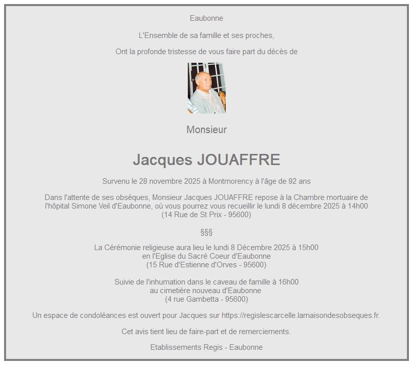 Cet espace « condoléances » est dédié à la mémoire de Monsieur Jacques JOUAFFRE.