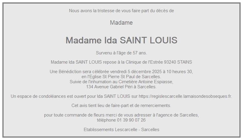 Cet espace « condoléances » est dédié à la mémoire de Madame Ida SAINT LOUIS .