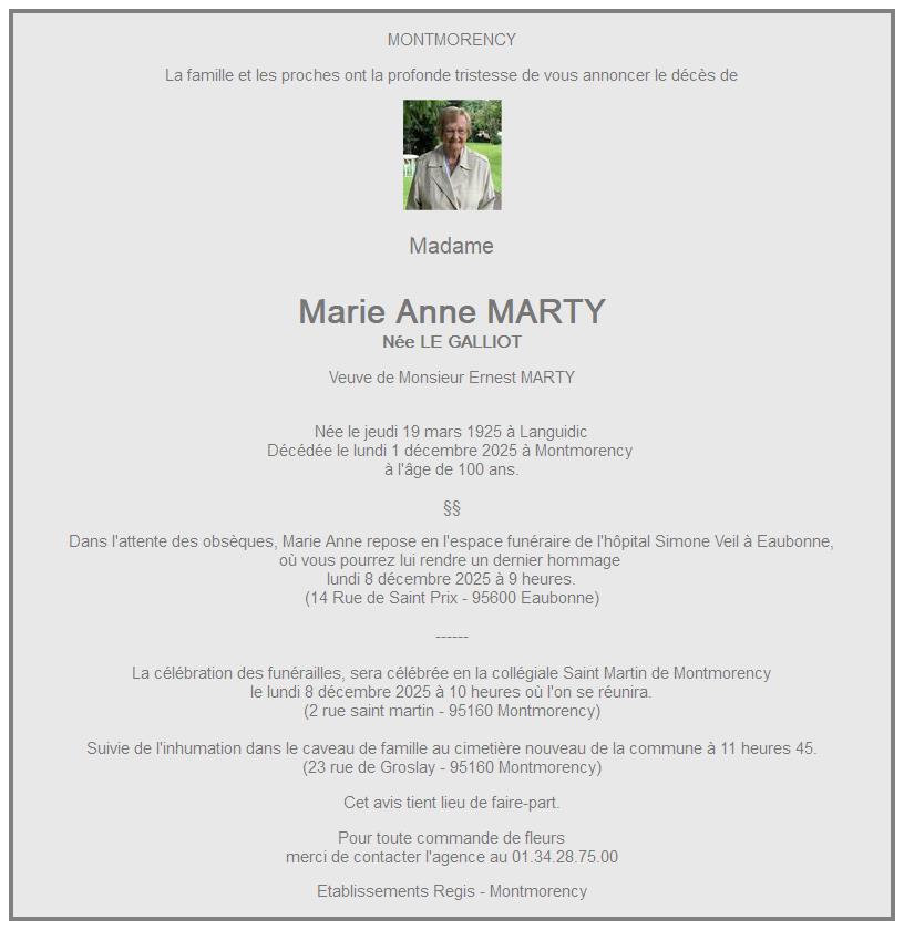 Cet espace « condoléances » est dédié à la mémoire de Madame Marie Anne MARTY née LE GALLIOT.