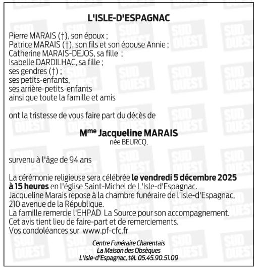 Cet espace « condoléances » est dédié à la mémoire de Madame JACQUELINE MARAIS née BEURCQ.