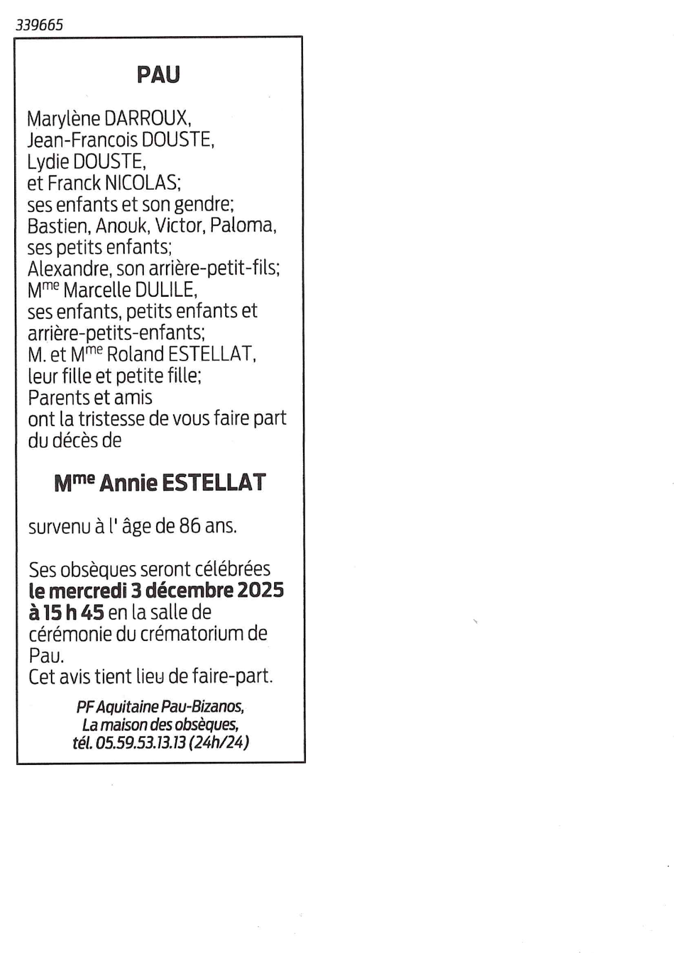 Cet espace « condoléances » est dédié à la mémoire de Madame Annie ESTELLAT.
