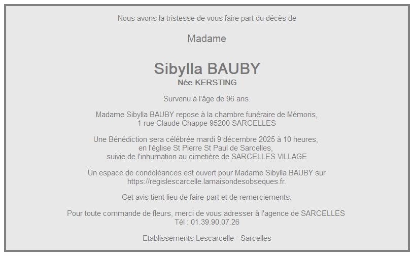 Cet espace « condoléances » est dédié à la mémoire de Madame Sibylla BAUBY née KERSTING.