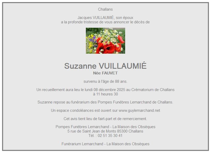 Cet espace « condoléances » est dédié à la mémoire de Madame Suzanne VUILLAUMIÉ née FAUVET.